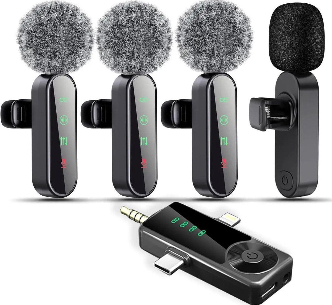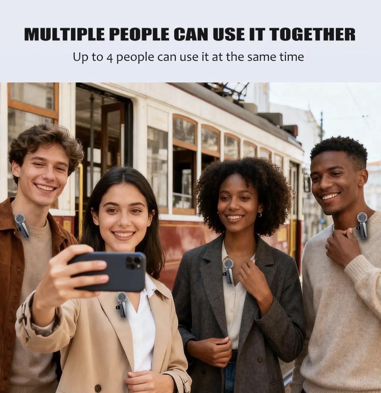 - Upgraded Design for 4 Person Voice wireless microphone. Supports simultaneous connection and pairing of up to 4 microphones, enabling seamless synchronized recording for four people without the need for post-production editing or splicing. Operation is simple with just two steps: insert the receiver into the device interface, turn on the microphone power, and automatic pairing is achieved with no app downloads or Bluetooth configuration required, truly delivering plug-and-play convenience. Note: Android devices require enabling the "OTG" function in settings before use.