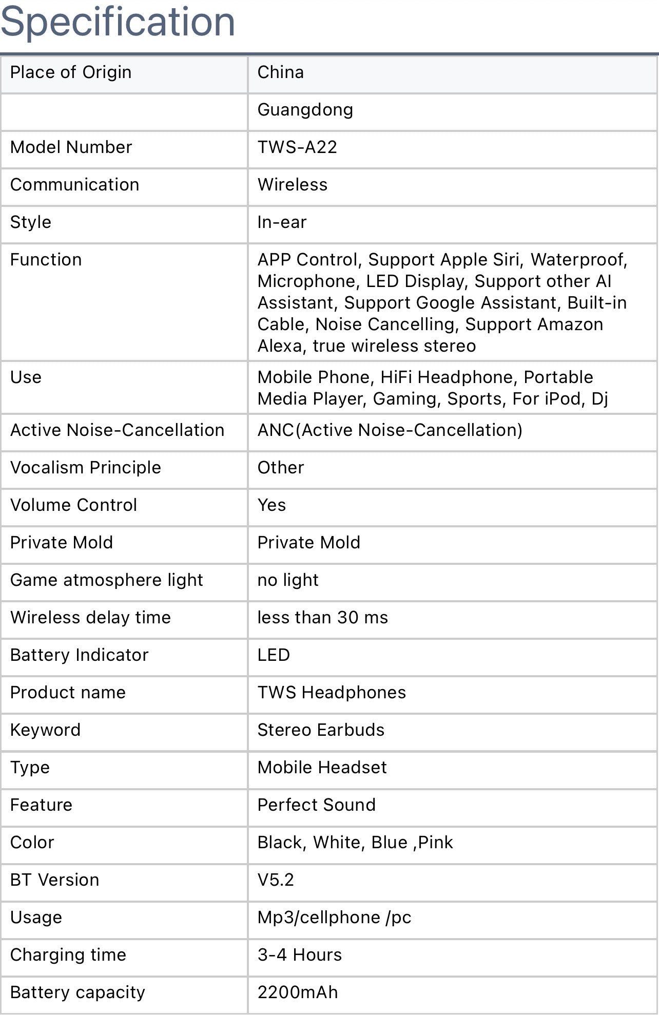 - 1 x Pair A22 Wireless Earbuds