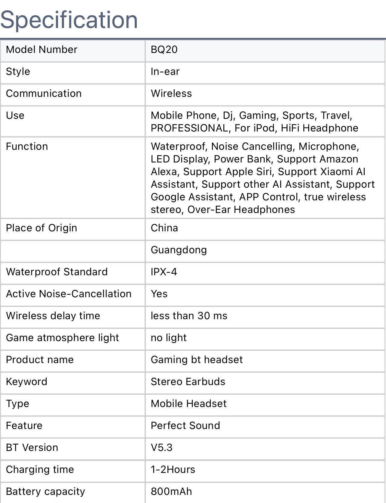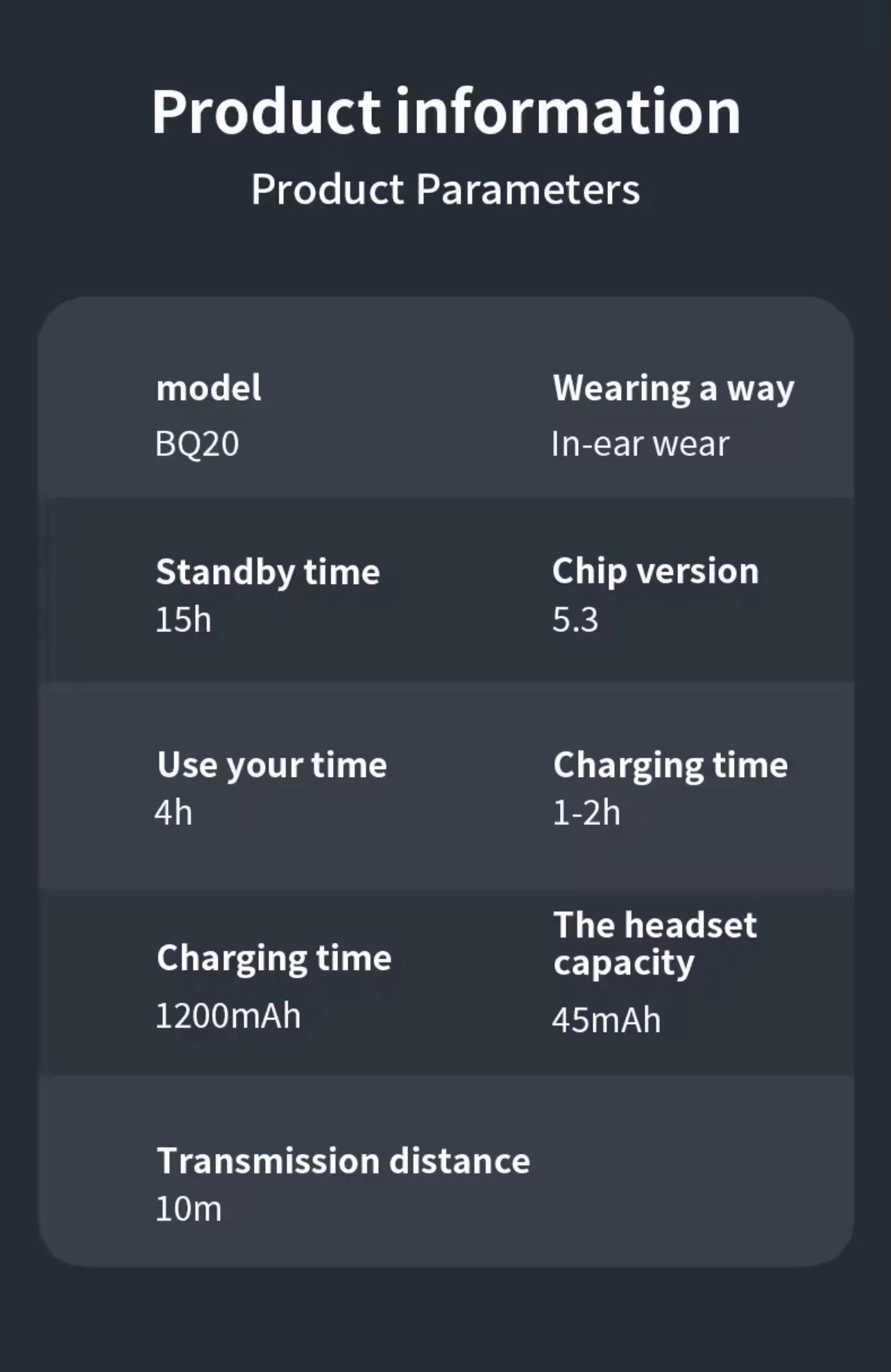 The BQ20 Hi-Fi Stereo Earbuds are wireless in-ear headphones designed for sports and gaming, featuring IPX6-equivalent water resistance and a digital LED display for monitoring battery levels. They