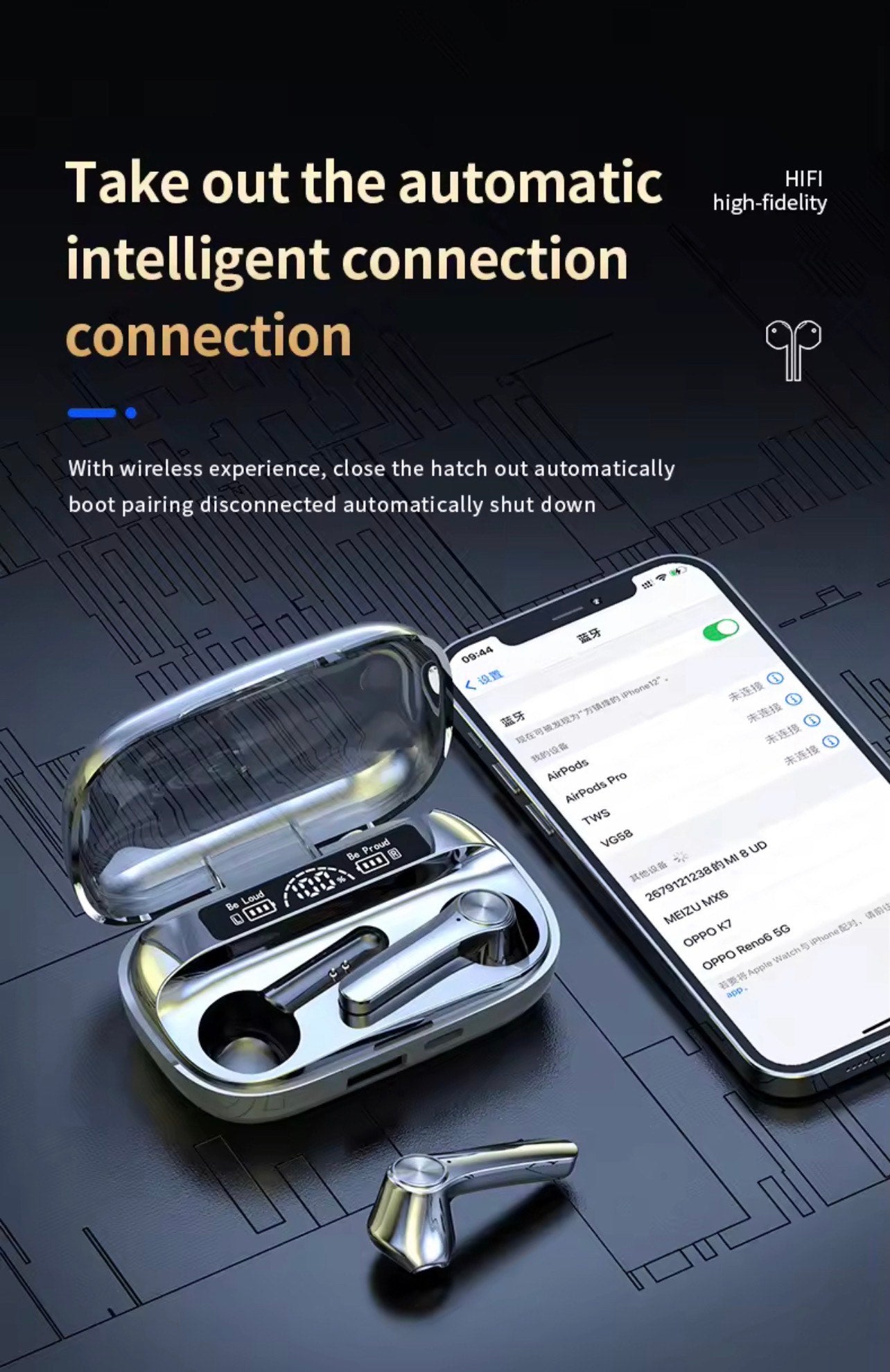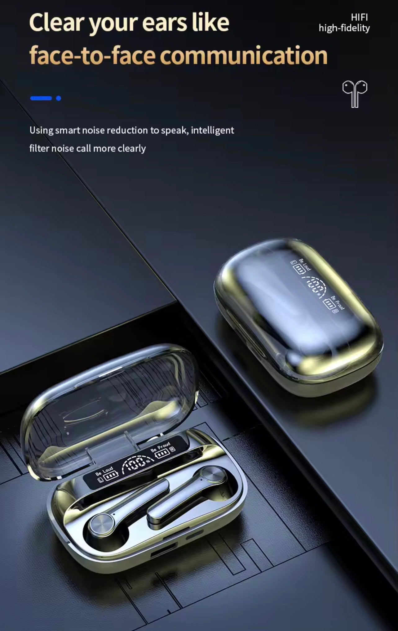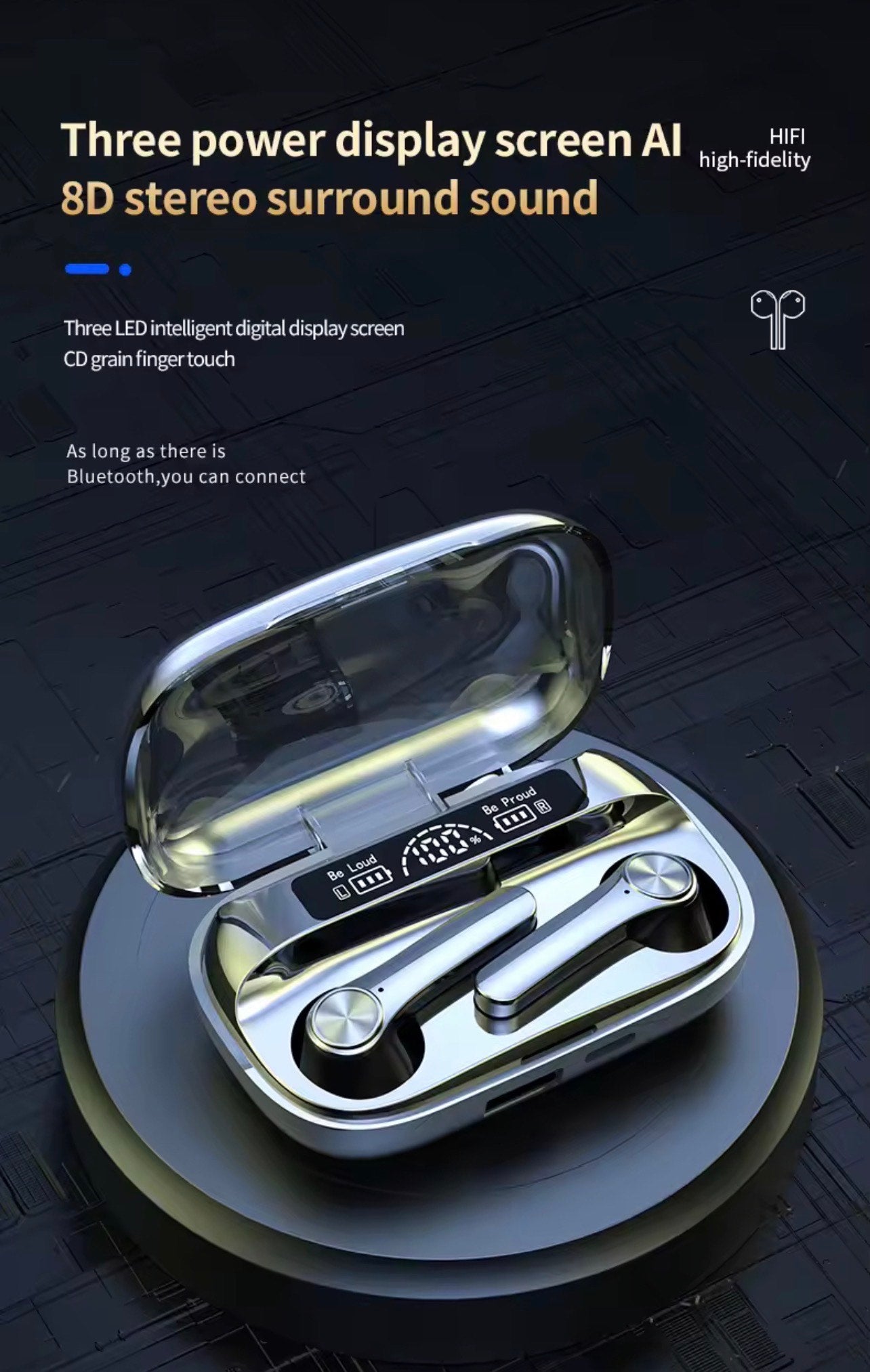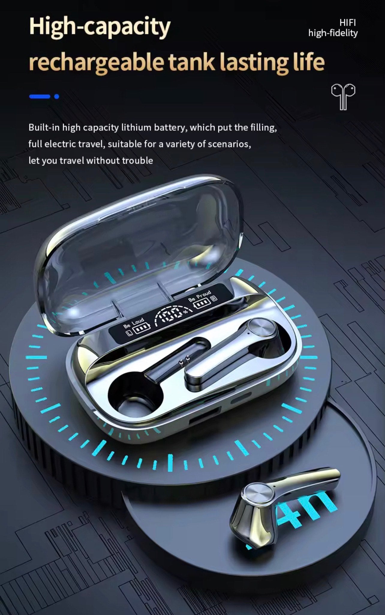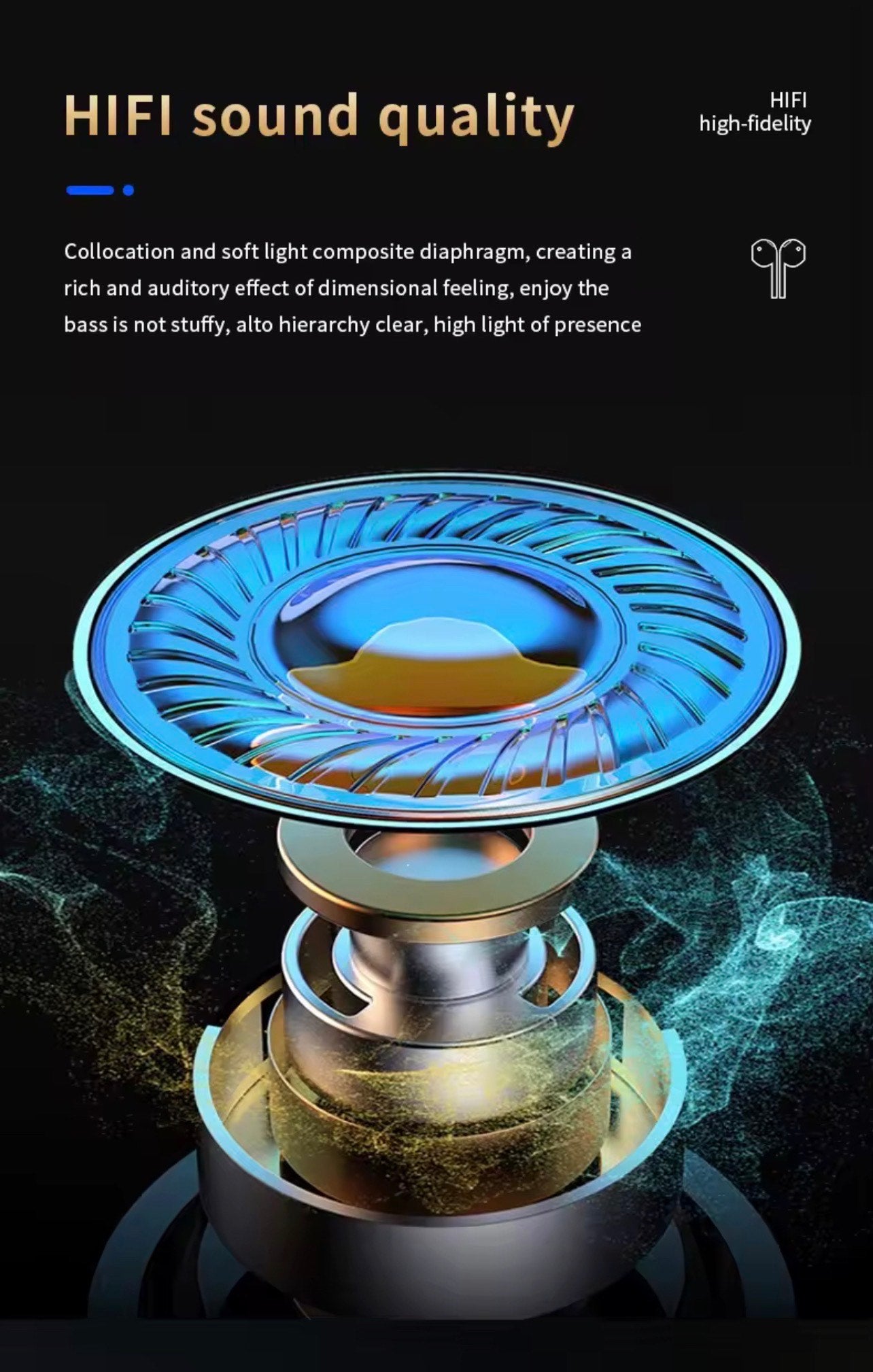 - Battery & Charging: Features a charging case with an LED digital display to show battery levels. Total playtime can last up to 40-60 hours, with 5-8 hours of continuous music on a single charge.