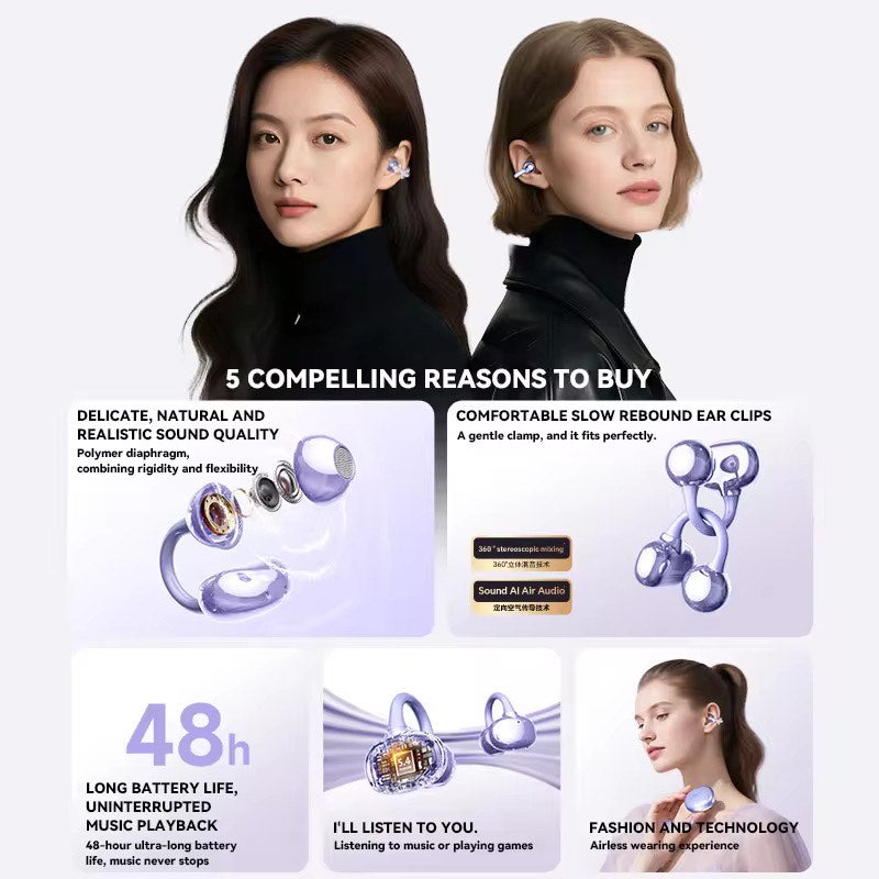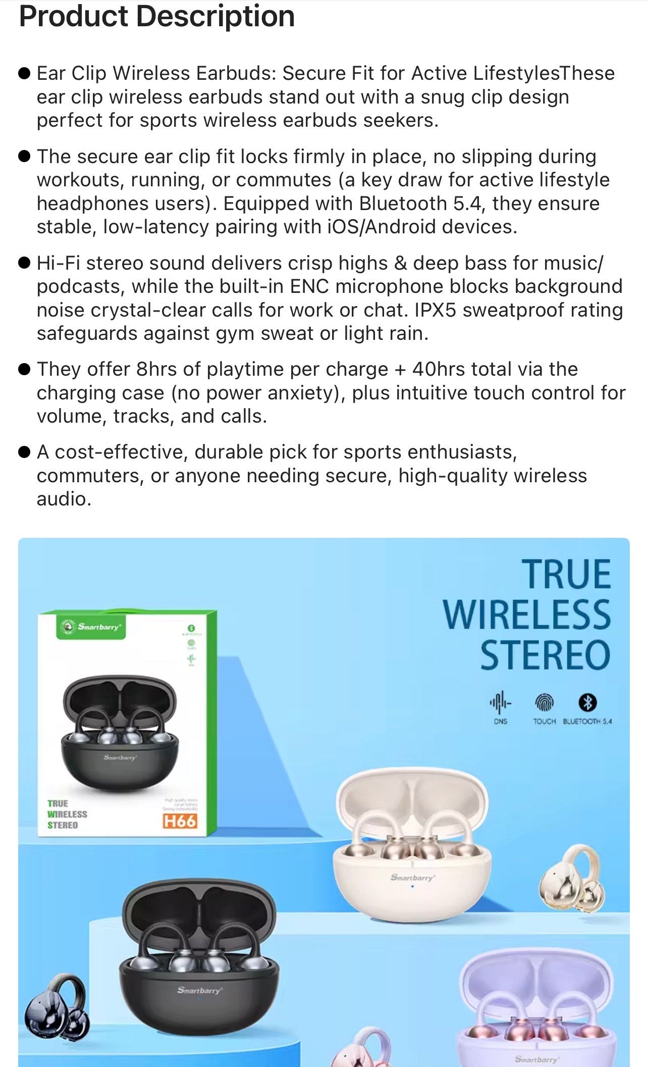 Experience a new standard of audio freedom with the H66 Ear Clip Wireless BT Earbuds. Designed for the active lifestyle, these earbuds utilize advanced air conduction technology to deliver superior 360-degree stereo sound without blocking your ear canal. Combining safety, comfort, and high-fidelity audio, the H66 is the perfect companion for running, cycling, working, or daily commuting.
