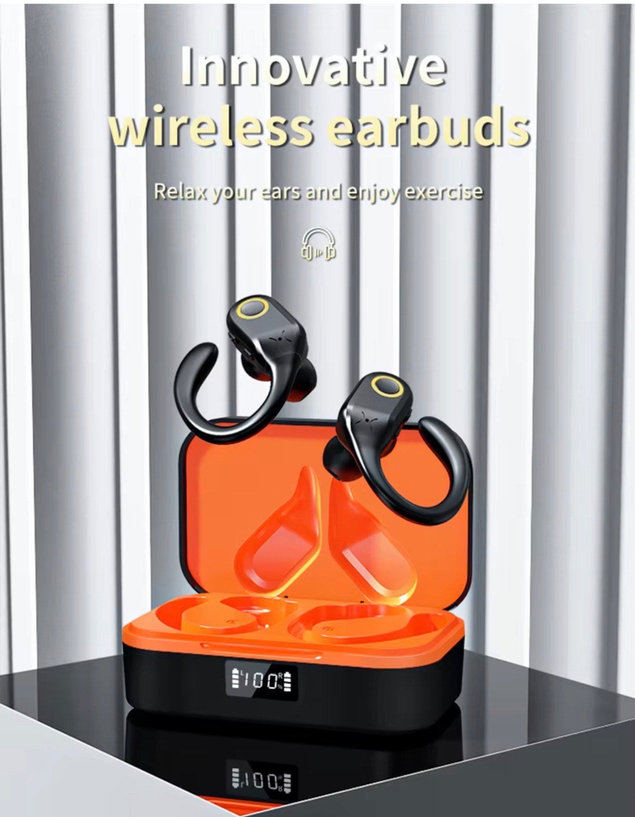 budget-friendly, wireless earhook earbuds designed for sports and active lifestyles, featuring both Active Noise Cancellation (ANC) and Environmental Noise Cancellation (ENC). They are characterized by a "secure-fit" ear hook design, high-fidelity sound, and a long-lasting battery with a digital LED display.
