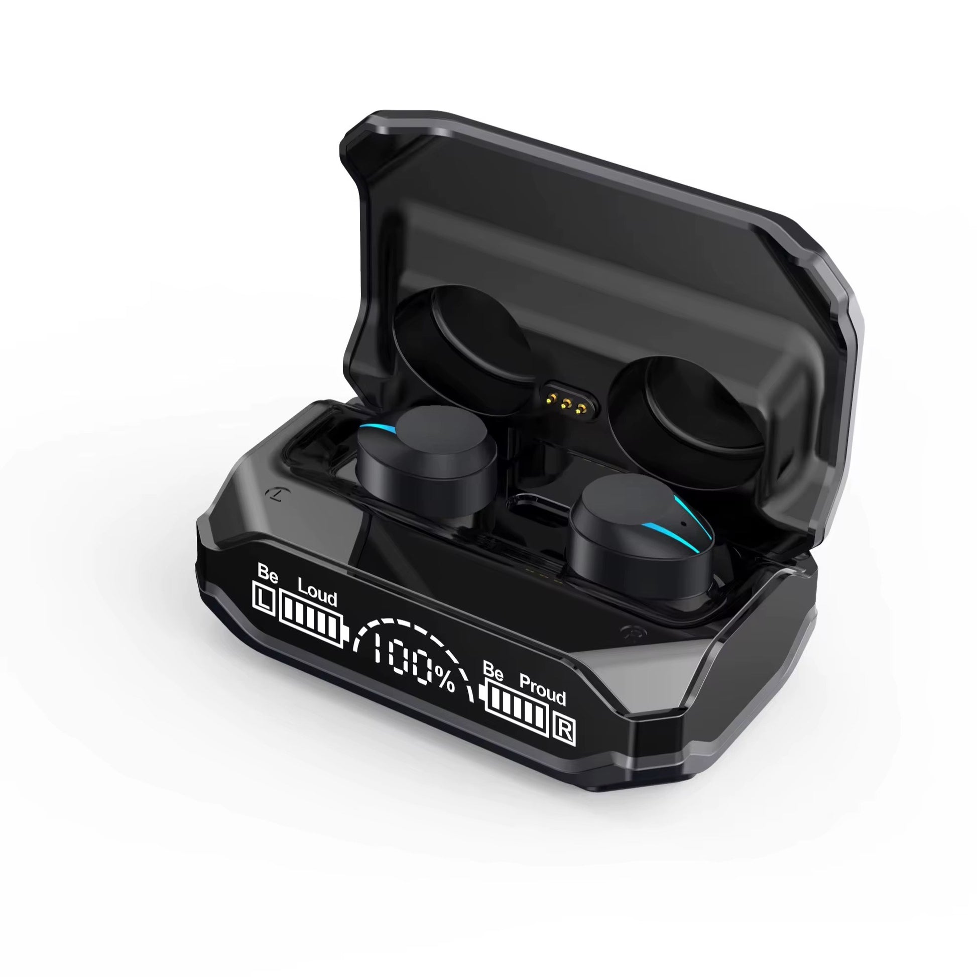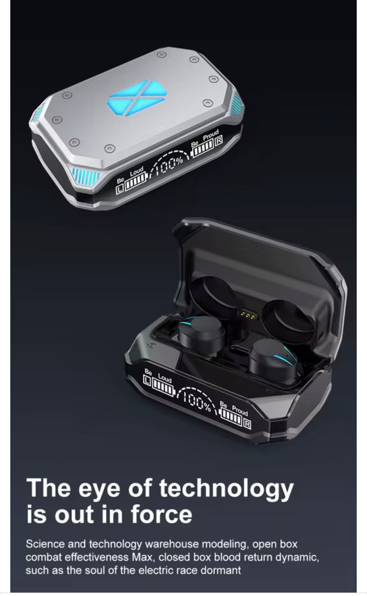 • Futuristic Mecha Design & LED Display: Featuring a metallic spray-painting process and a stylish, sci-fi-inspired "mecha" look, these earbuds are designed for durability and style. The charging case includes a smart LED digital display showing the battery percentage of both the case and the earbuds.