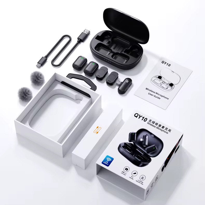 QY10 PRIVATE MODEL WIRELESS 2IN1 LAPEL MICROPHONE WITH APPLE & TYPE C CONNECTORS AND CHARGING CASE