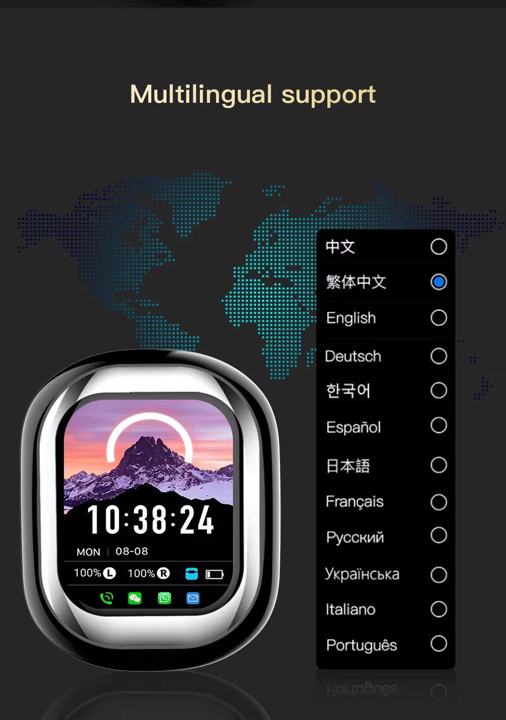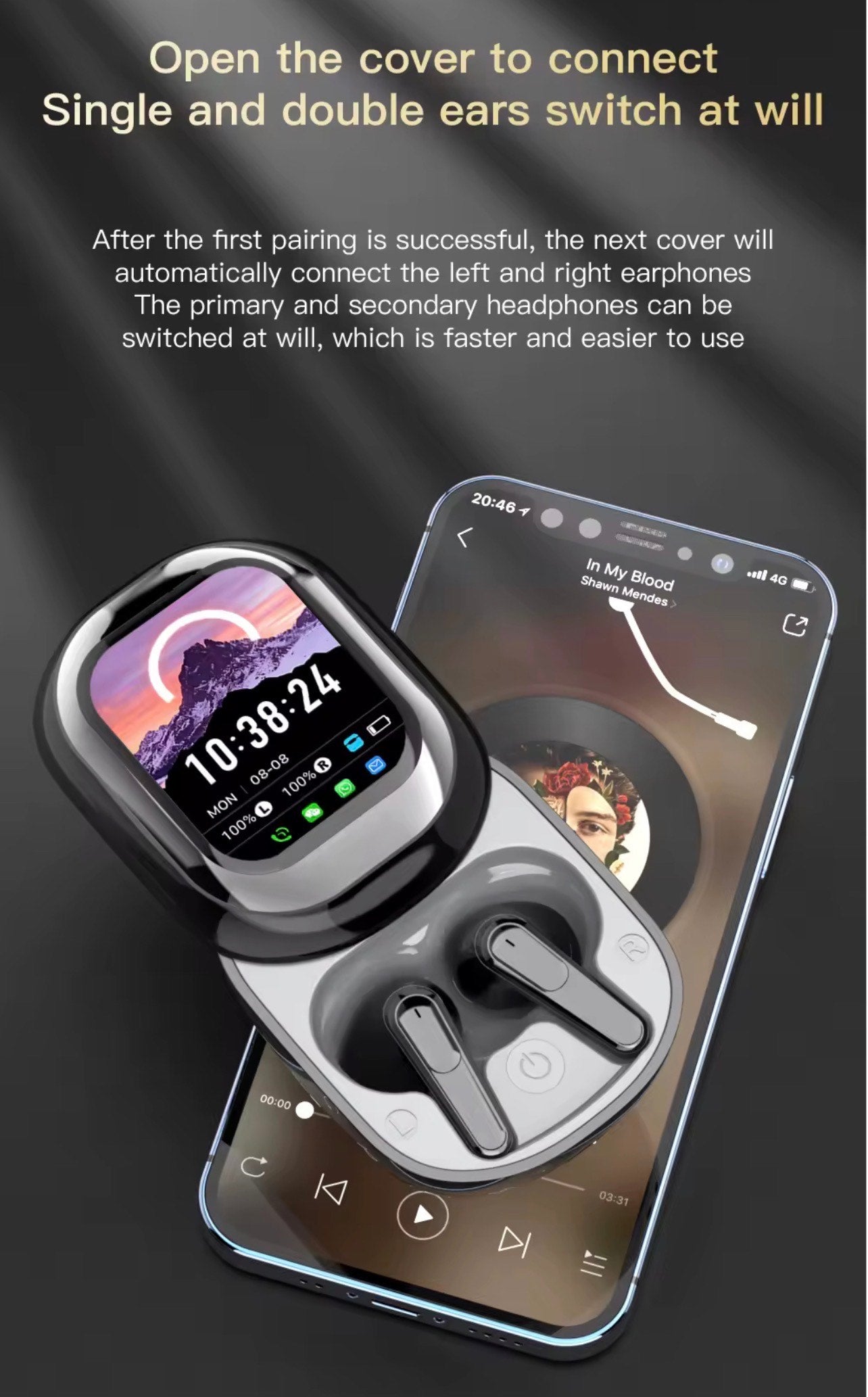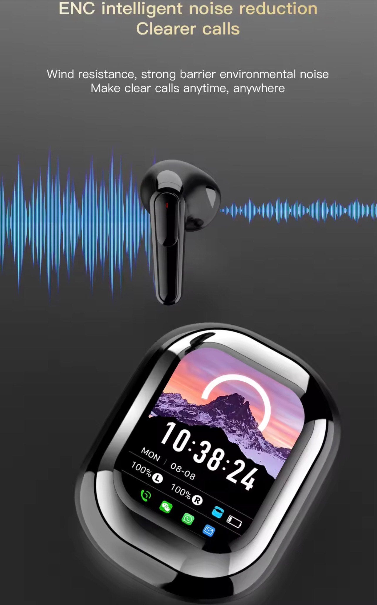 - Full-Color Touch Screen Case: The charging case features a smart screen that allows you to manage various functions directly, including viewing time, battery levels, and app notifications (WhatsApp, Facebook, Skype). The screen also supports customizable wallpapers.