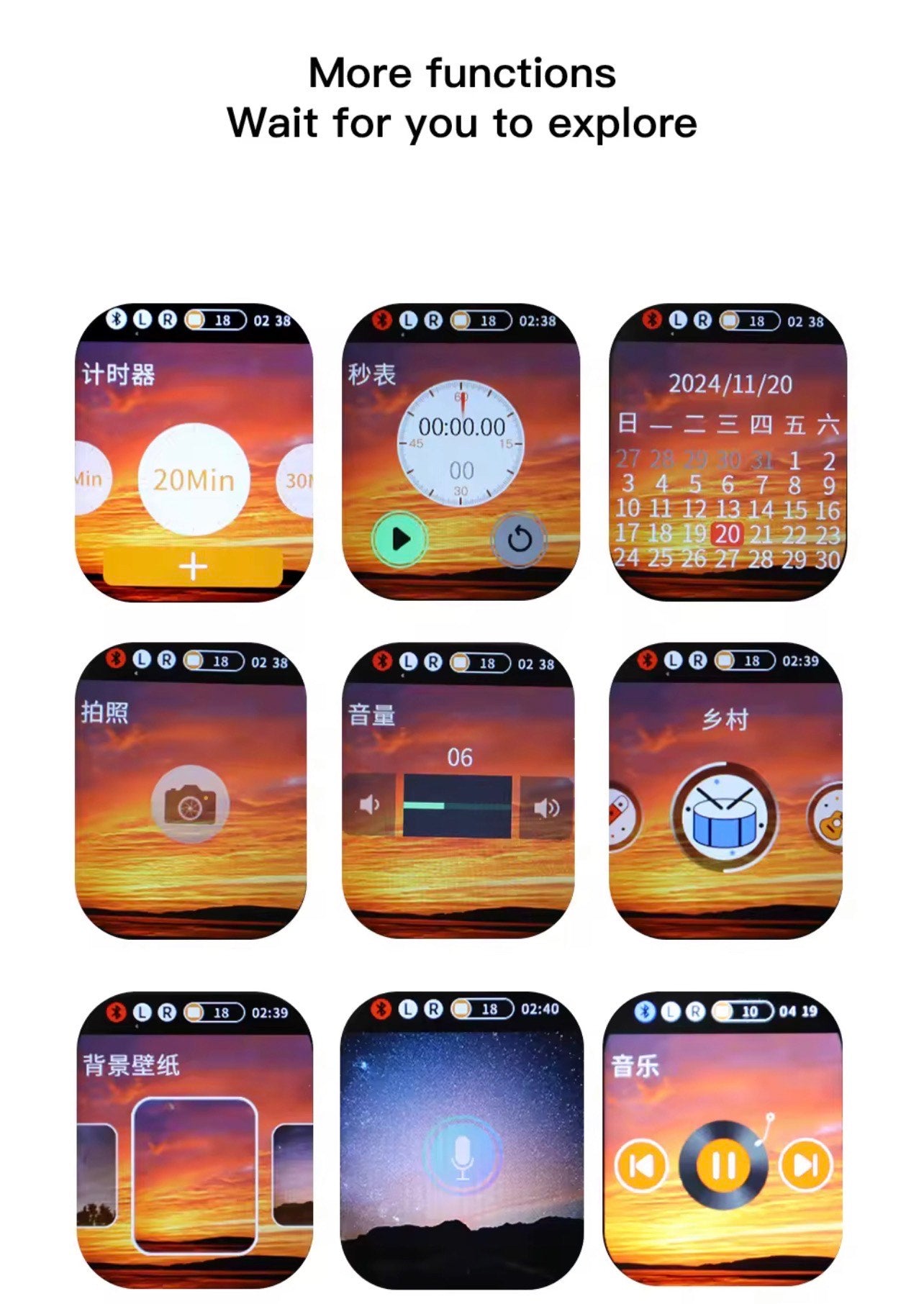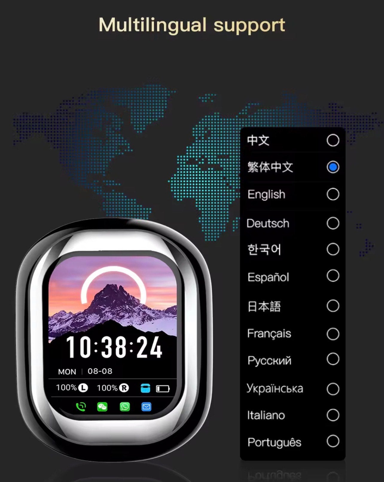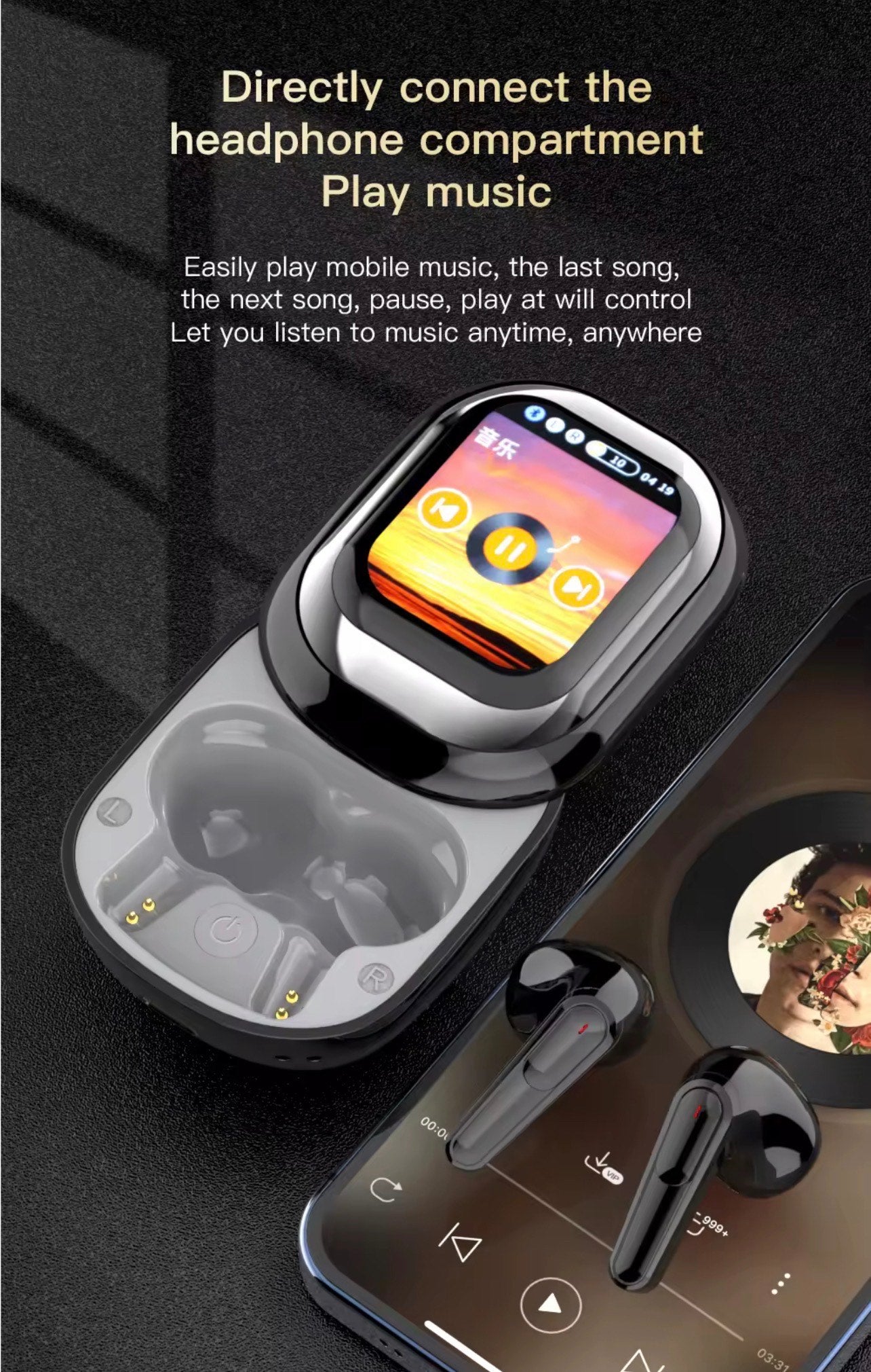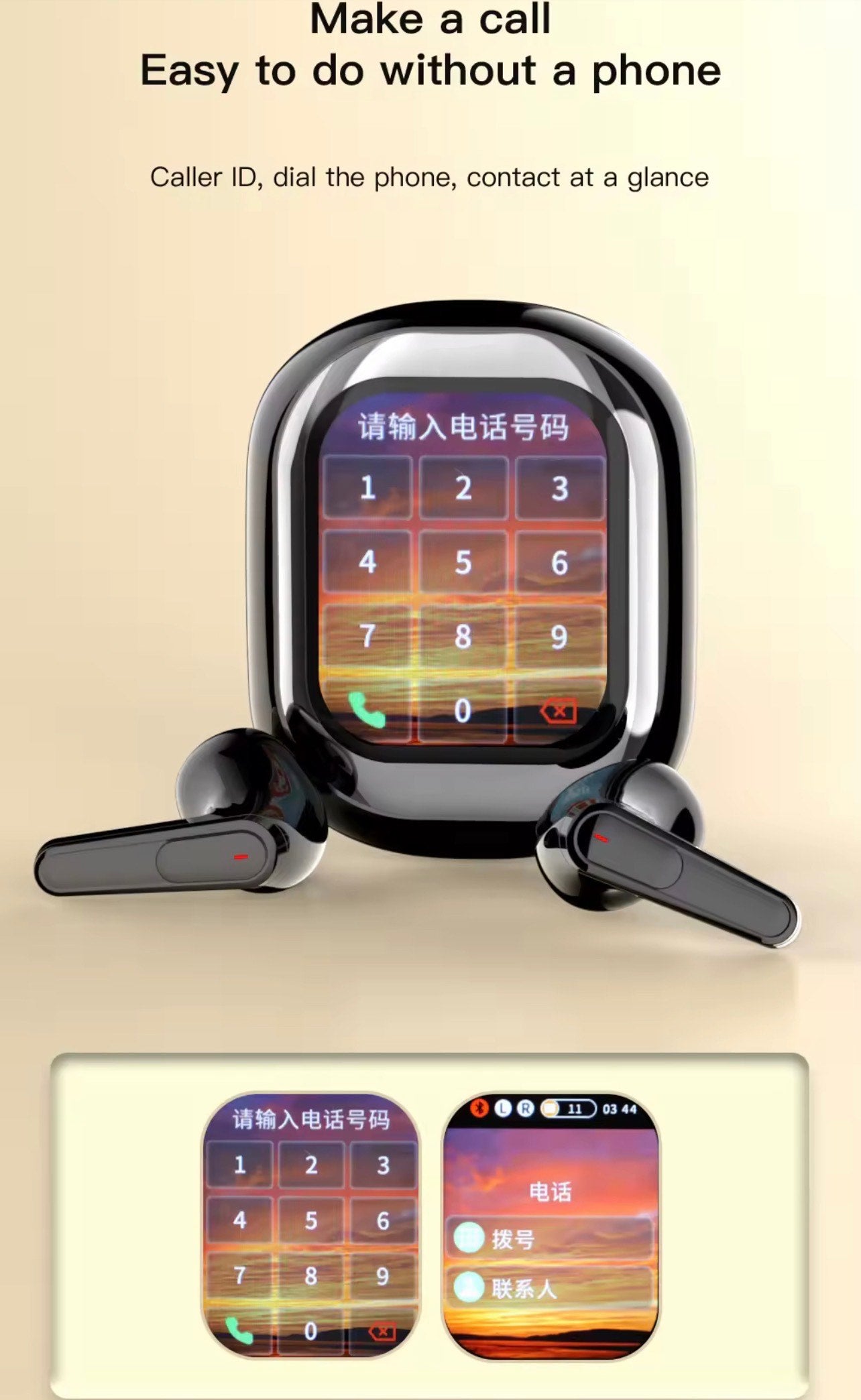 - Full-Color Touch Screen Case: The charging case features a smart screen that allows you to manage various functions directly, including viewing time, battery levels, and app notifications (WhatsApp, Facebook, Skype). The screen also supports customizable wallpapers.
