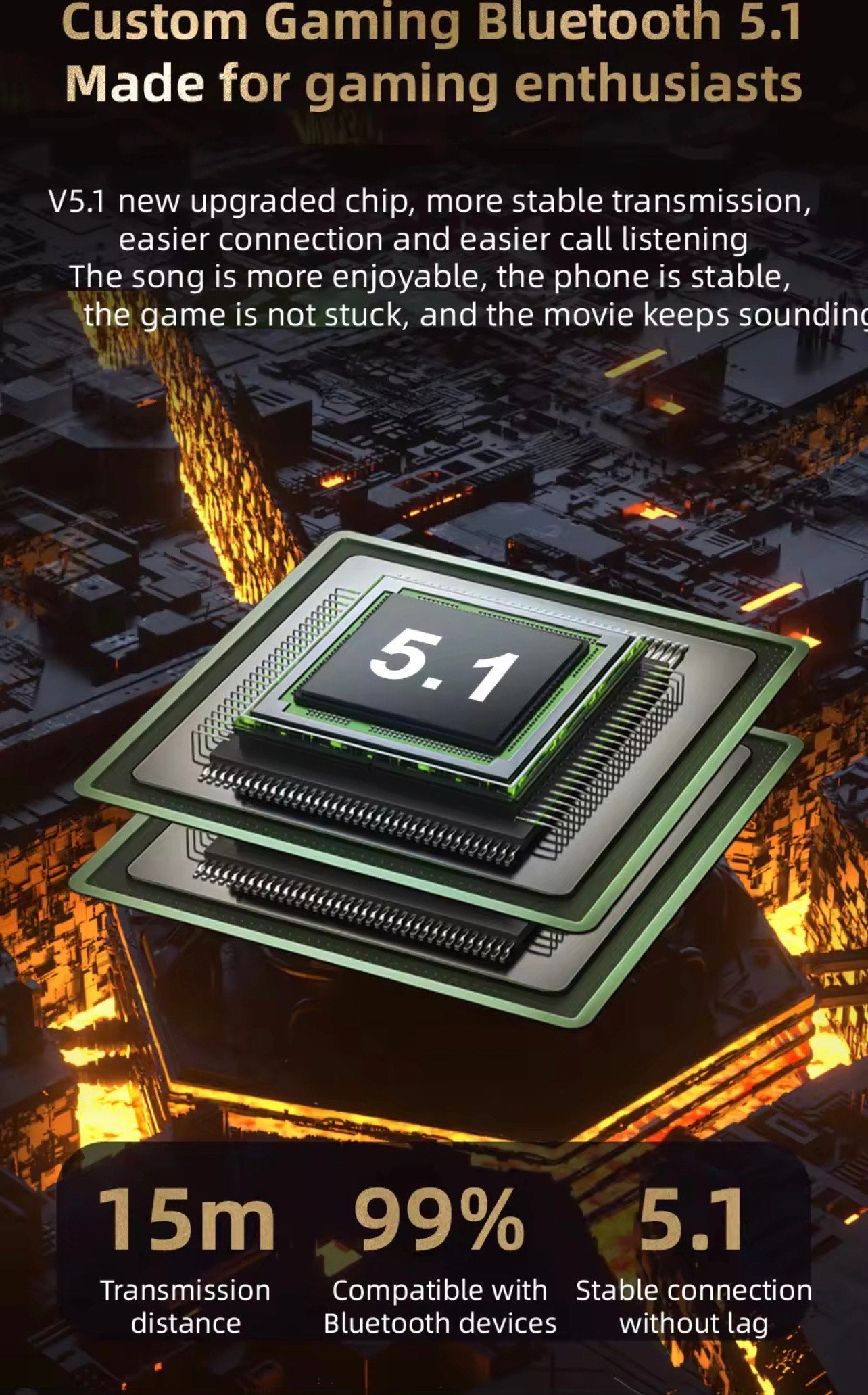 - Connectivity: Equipped with the latest Bluetooth 5.3 chip for a stable connection (up to 15m) and low latency, making it suitable for gaming and music streaming.